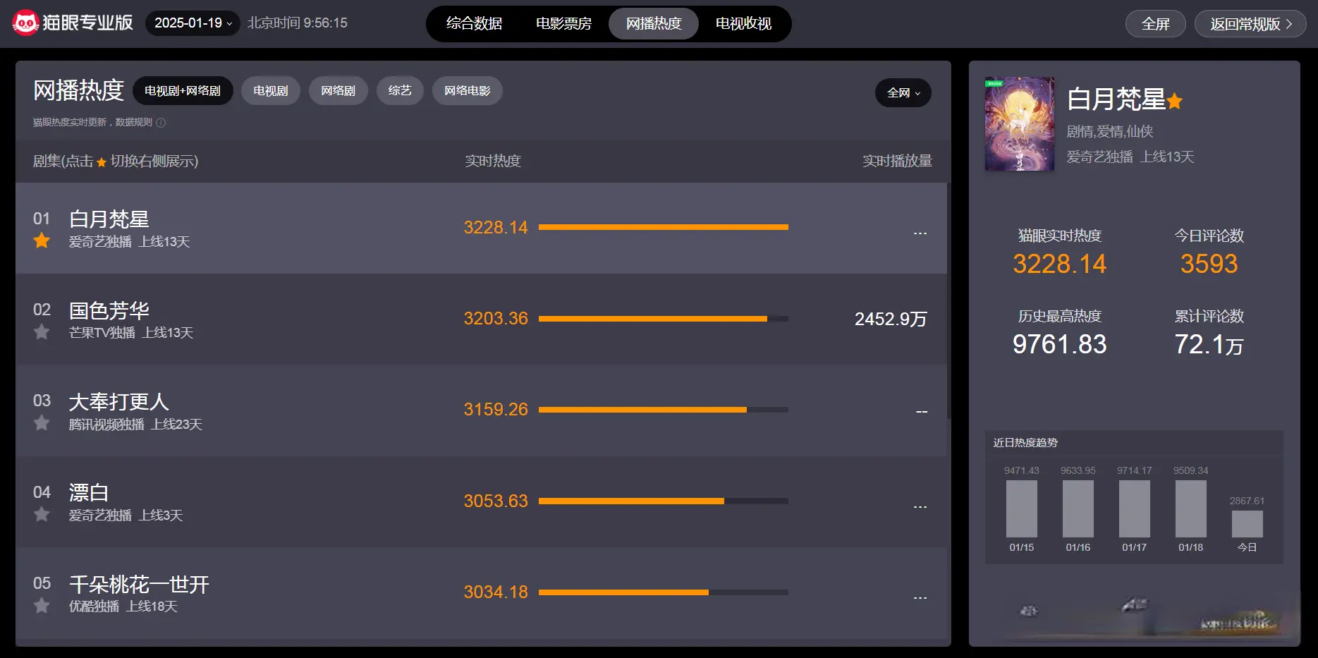 电视剧网播热度榜,《漂白》排在倒数,《国色芳华》跌至第二